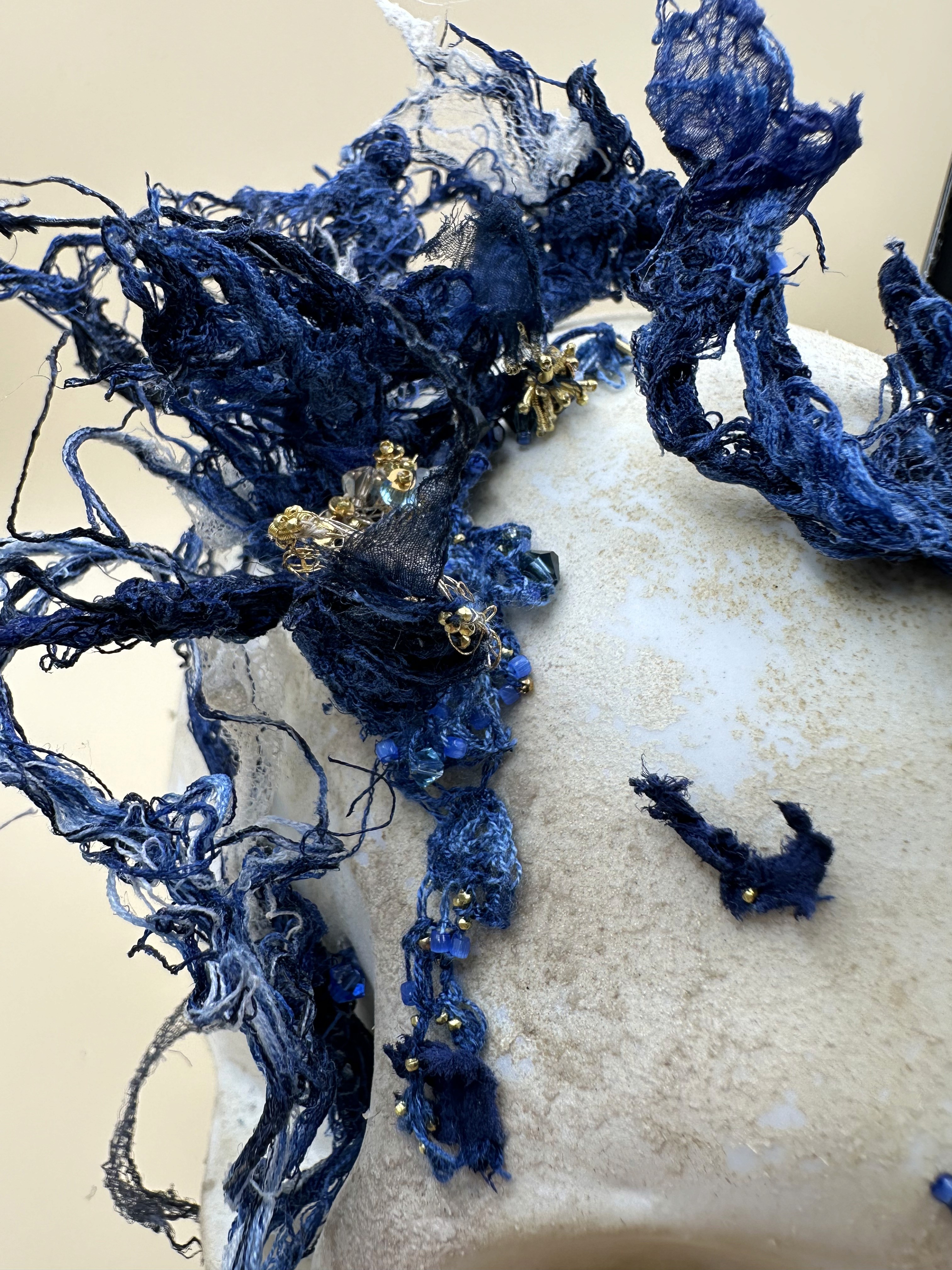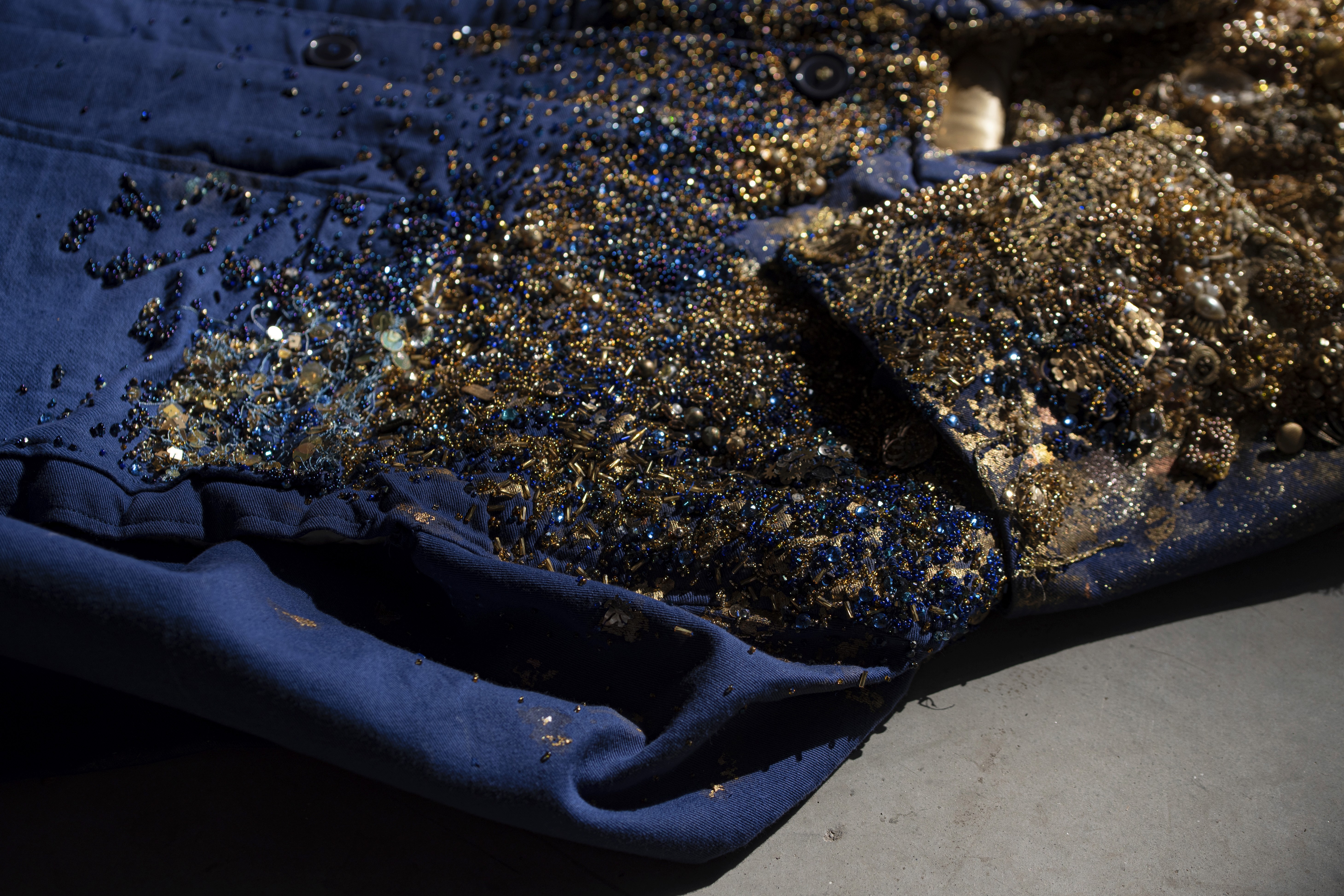 Aurélie Lanoiselée expresses her unique skill through embroidery, embellishment, and textile transformation. Since opening her studio in 2002, she has combined traditional techniques such as hand embroidery and Lunéville crochet with experimental methods of fabric enhancement. Dyeing, coating, and layering allow her to reshape the appearance and structure of materials. She regularly reuses threads and components, breathing new life into overlooked elements and expanding their narrative potential.