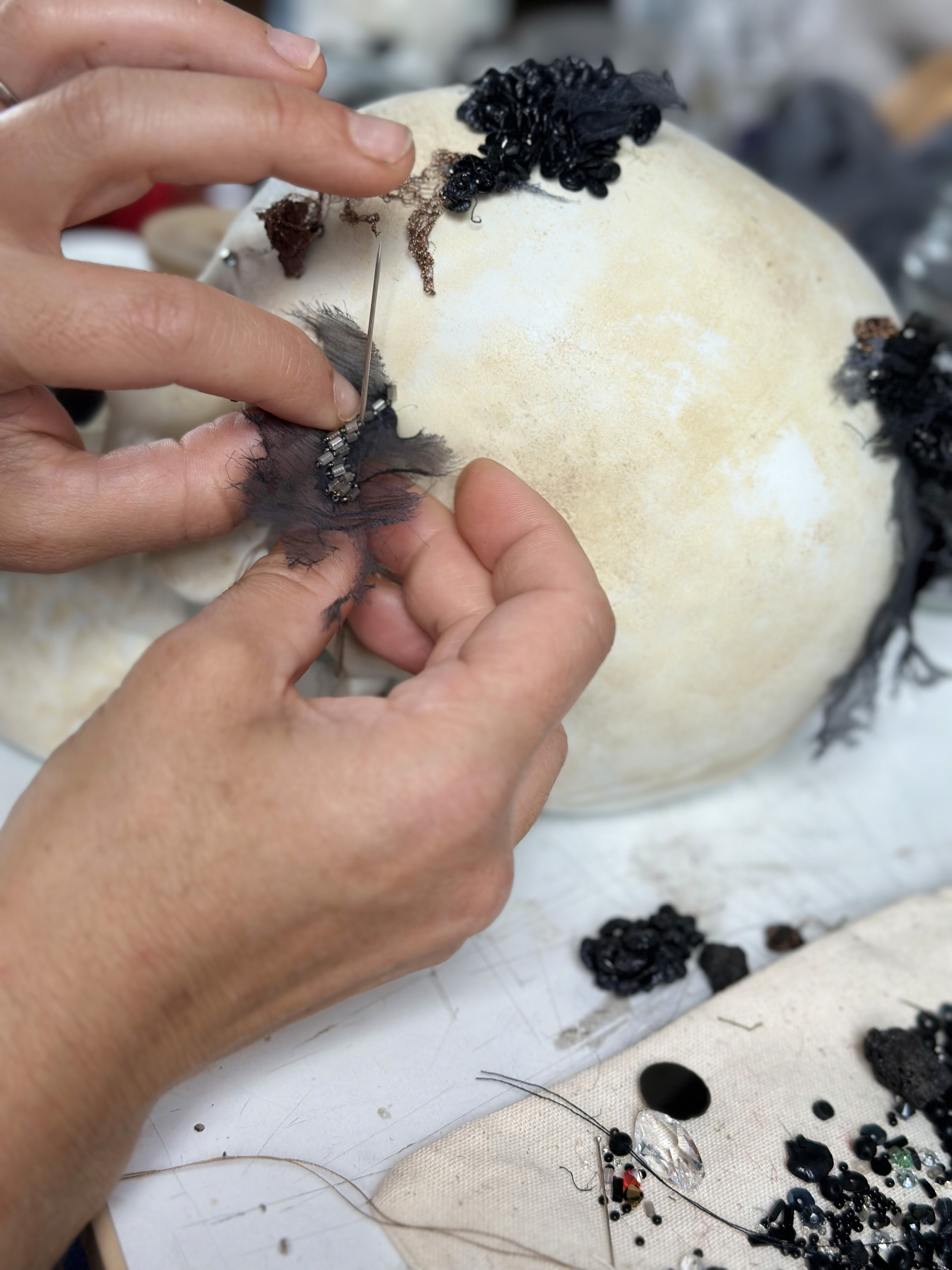Her three-dimensional approach allows her to work across surfaces and volumes on any perforable base. By extending embroidery beyond its conventional contexts, she blurs the lines between fine art, decorative arts, and craft. From unique pieces to small series, her savoir-faire is applied across haute couture, interior decoration, design, and collaborative textile environments.