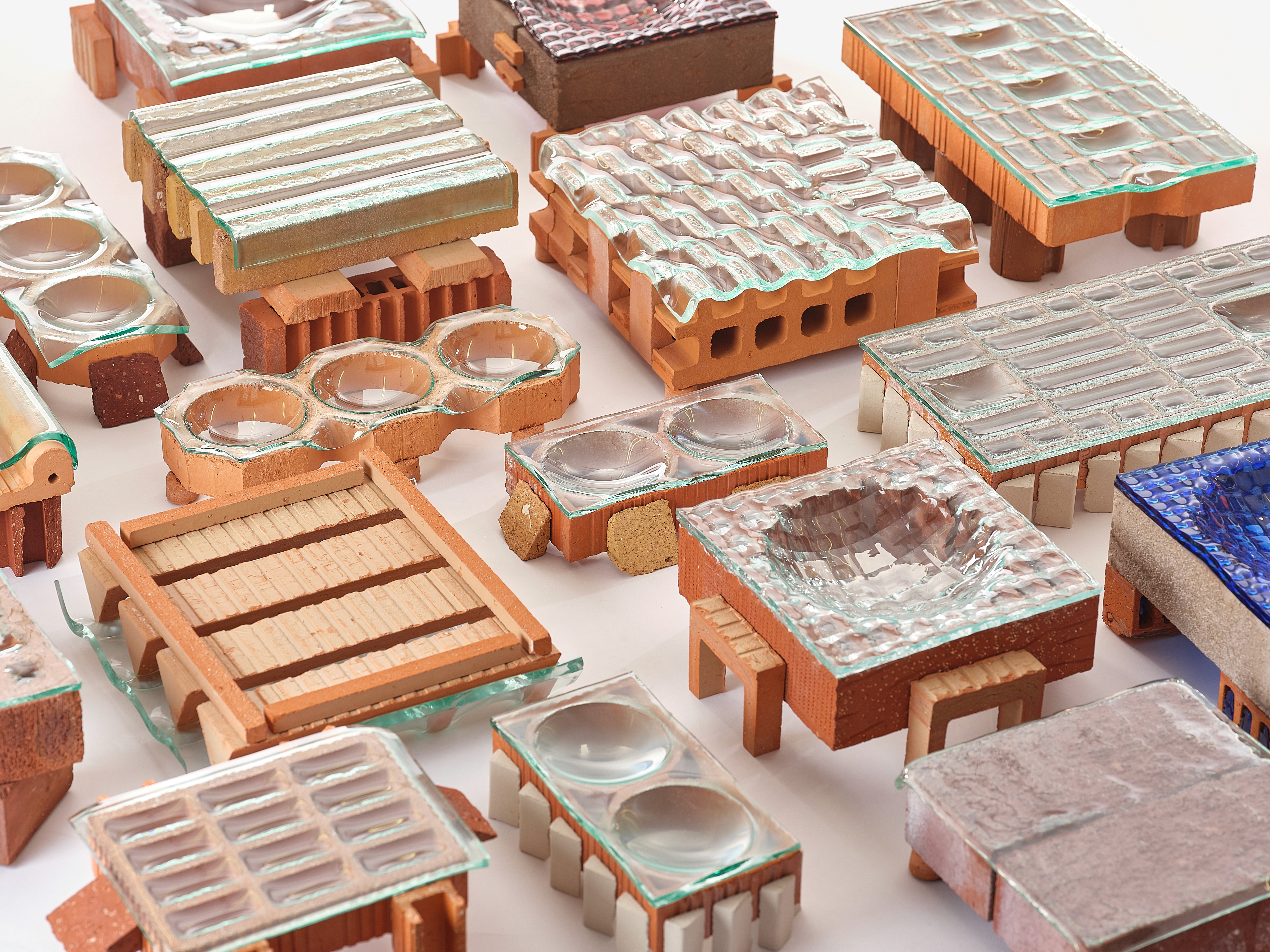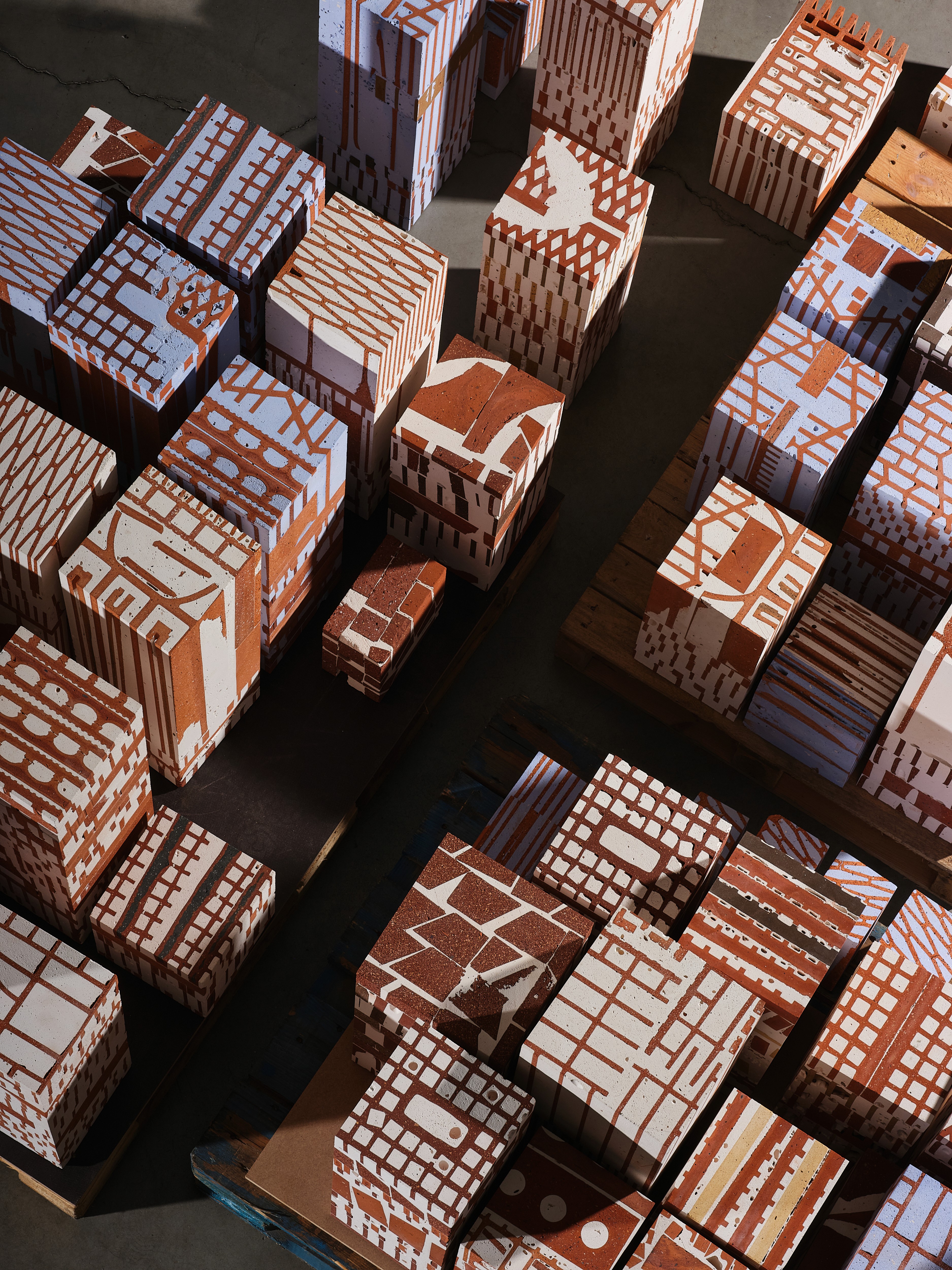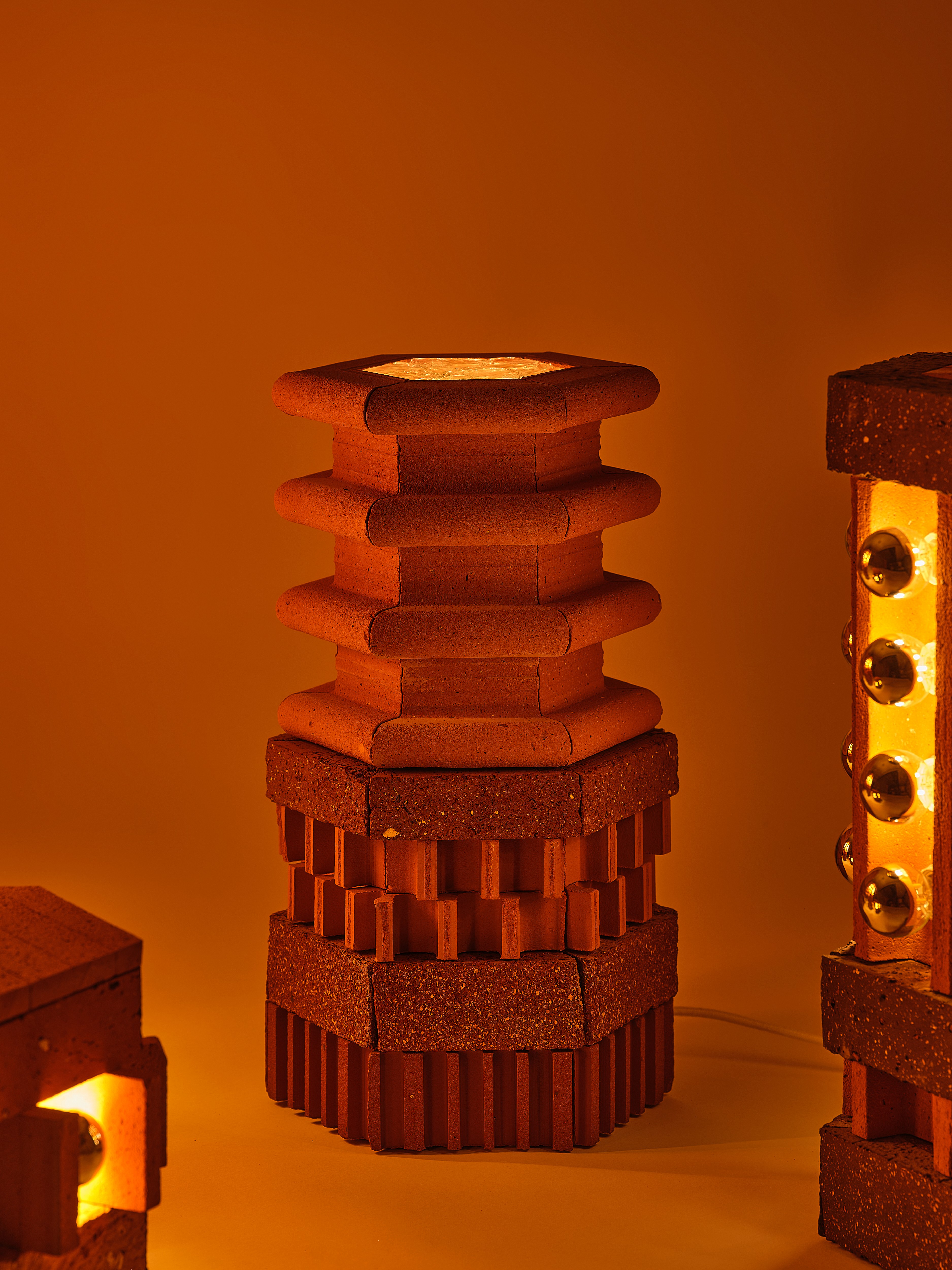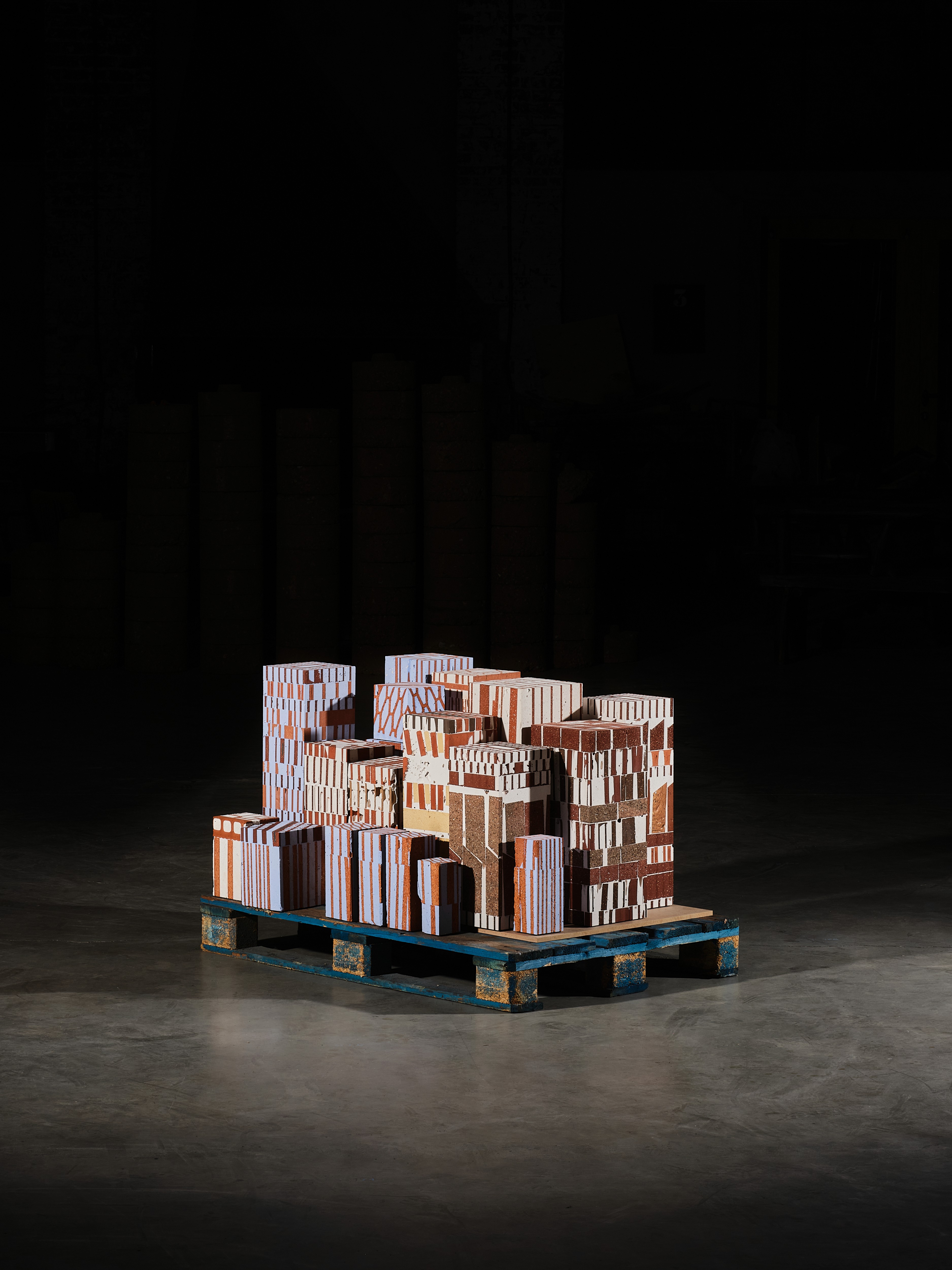 Brick is central to his practice. He sources discarded or forgotten bricks, which he washes, dries, cuts, and recomposes into modular sculptural columns and fragments. This work draws inspiration from architecture and the overlooked potential of industrial waste. Using offcuts, rainwater, concrete, plaster, and recovered glass, he creates layered compositions that blur the line between object, sculpture, and structure. Through these iterative processes, he builds a visual language rooted in reuse, texture, and contrast.