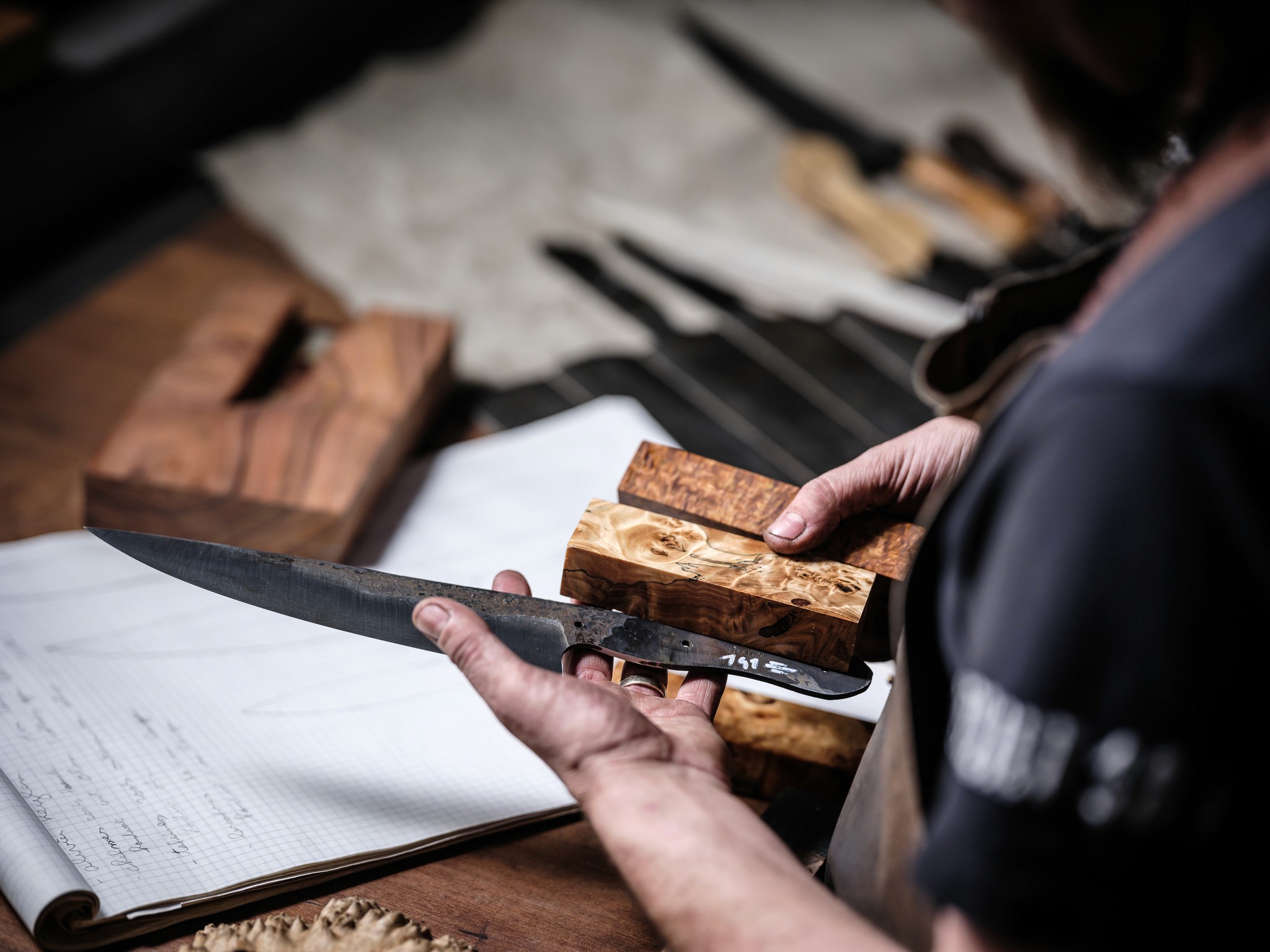 Atelier185 creates hand-forged knives and blades that combine technical precision with refined craft. From kitchen and table knives to hunting blades and decorative swords, each piece is forged by hand using high-quality materials such as Damascus carbon steel or the raw single-layer Brut de Forge method.