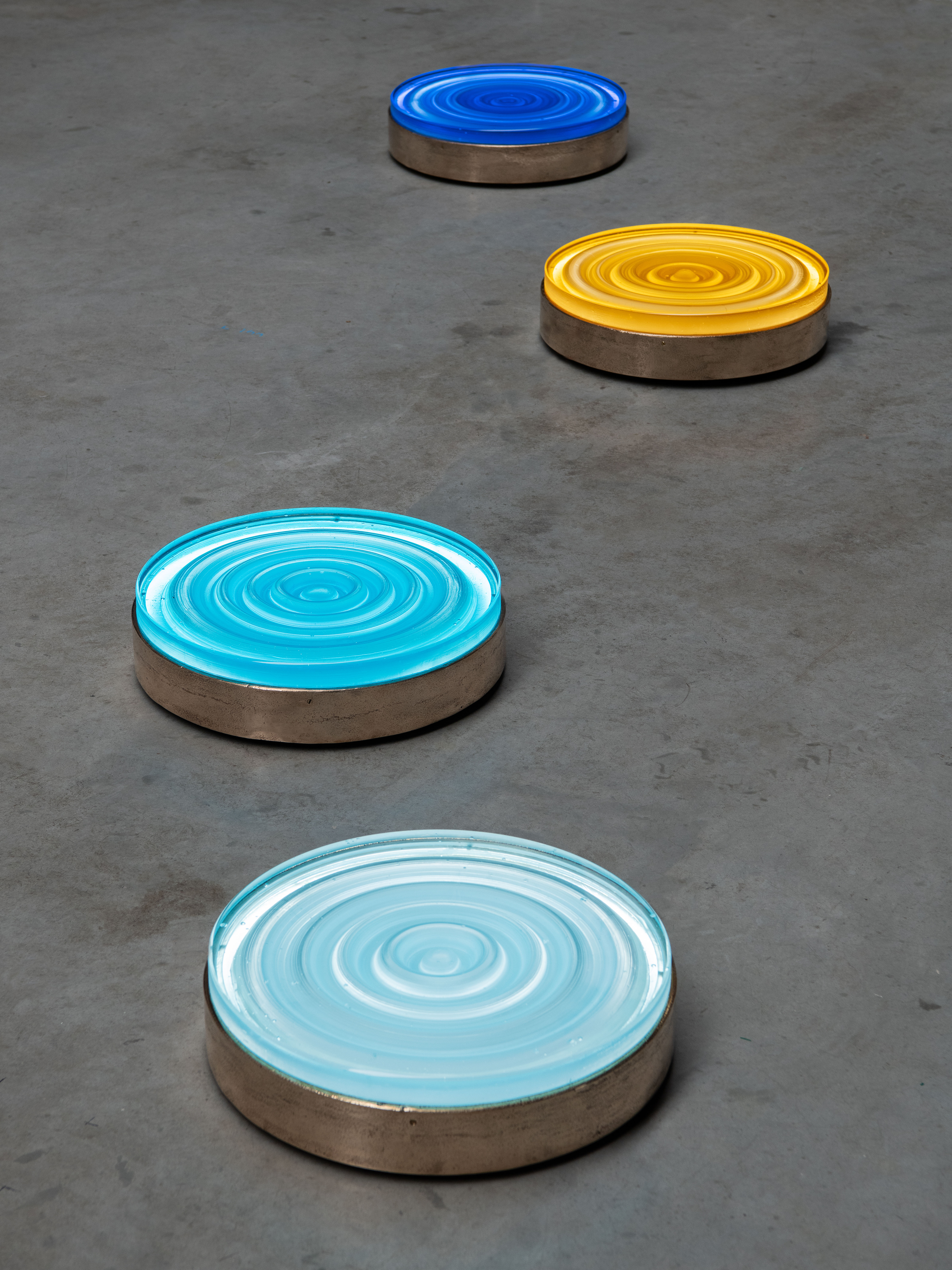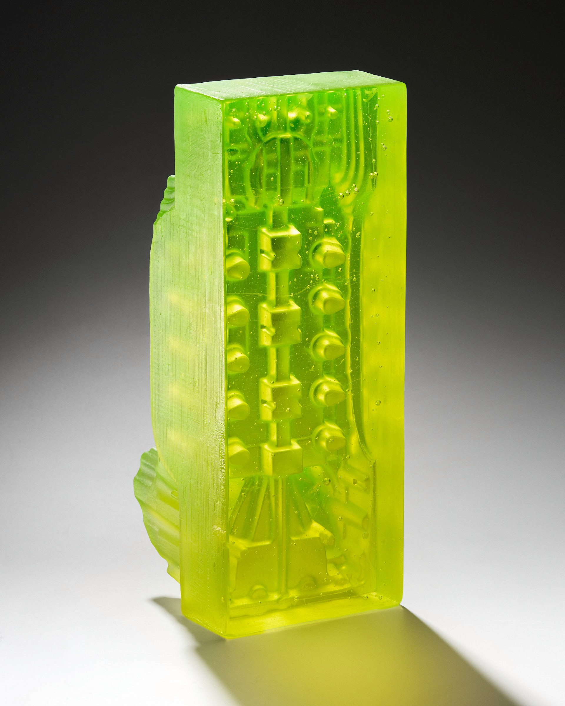 Farget also reinterprets industrial packaging as sculptural material, casting disposable cardboard forms into lasting glass objects. Recently, she has expanded her process by integrating bronze casting into bas-relief wall works, inspired by the movement of water and subtle distortions in surface tension.