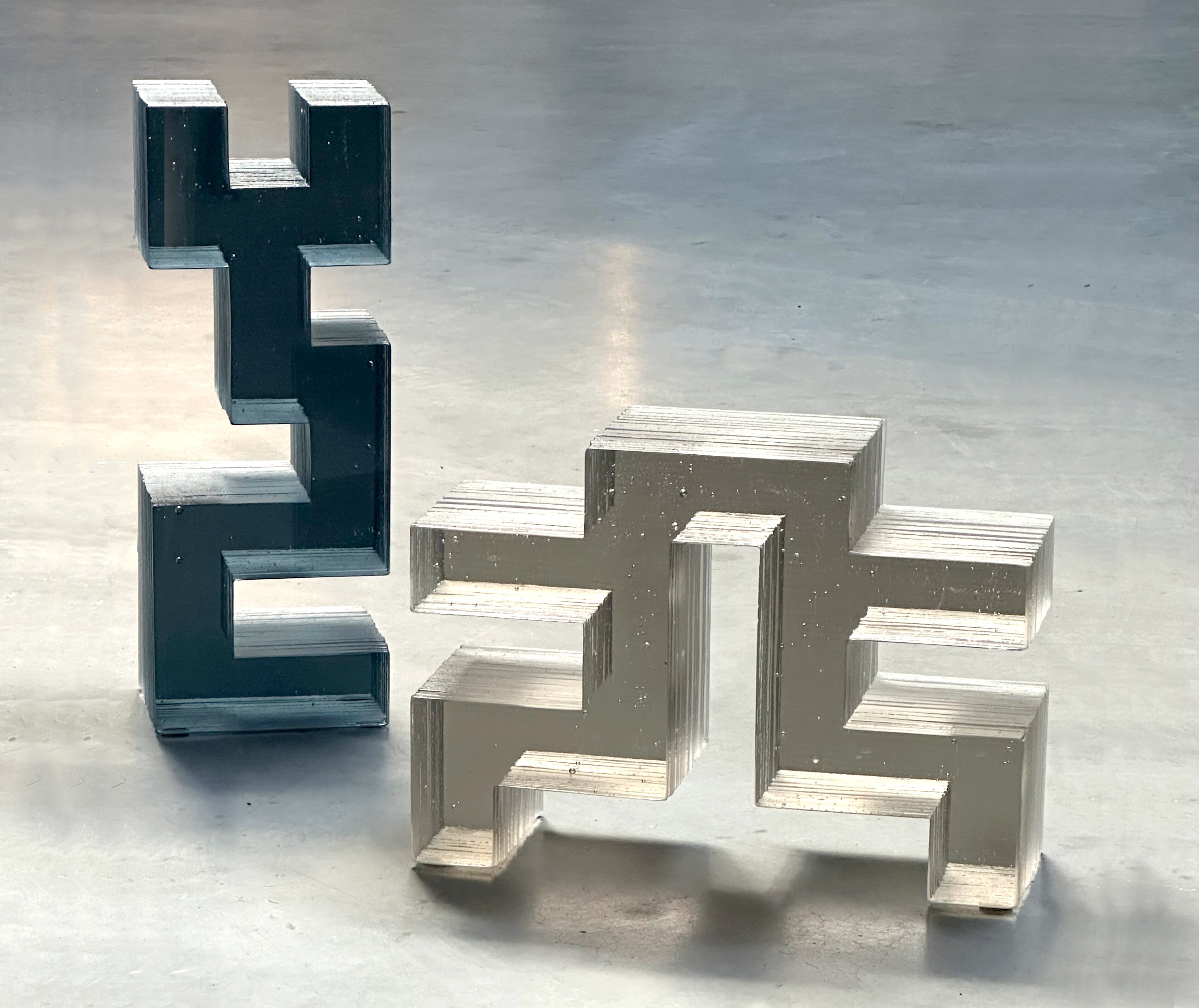 Her sculptures often take the shape of architectural volumes and layered constructions, echoing geological strata or symbolic dwellings. These forms evoke stages of memory, utopian space, and emotional structure. Her work engages with transparency and mass, offering multiple readings through light, shadow, and interior voids.