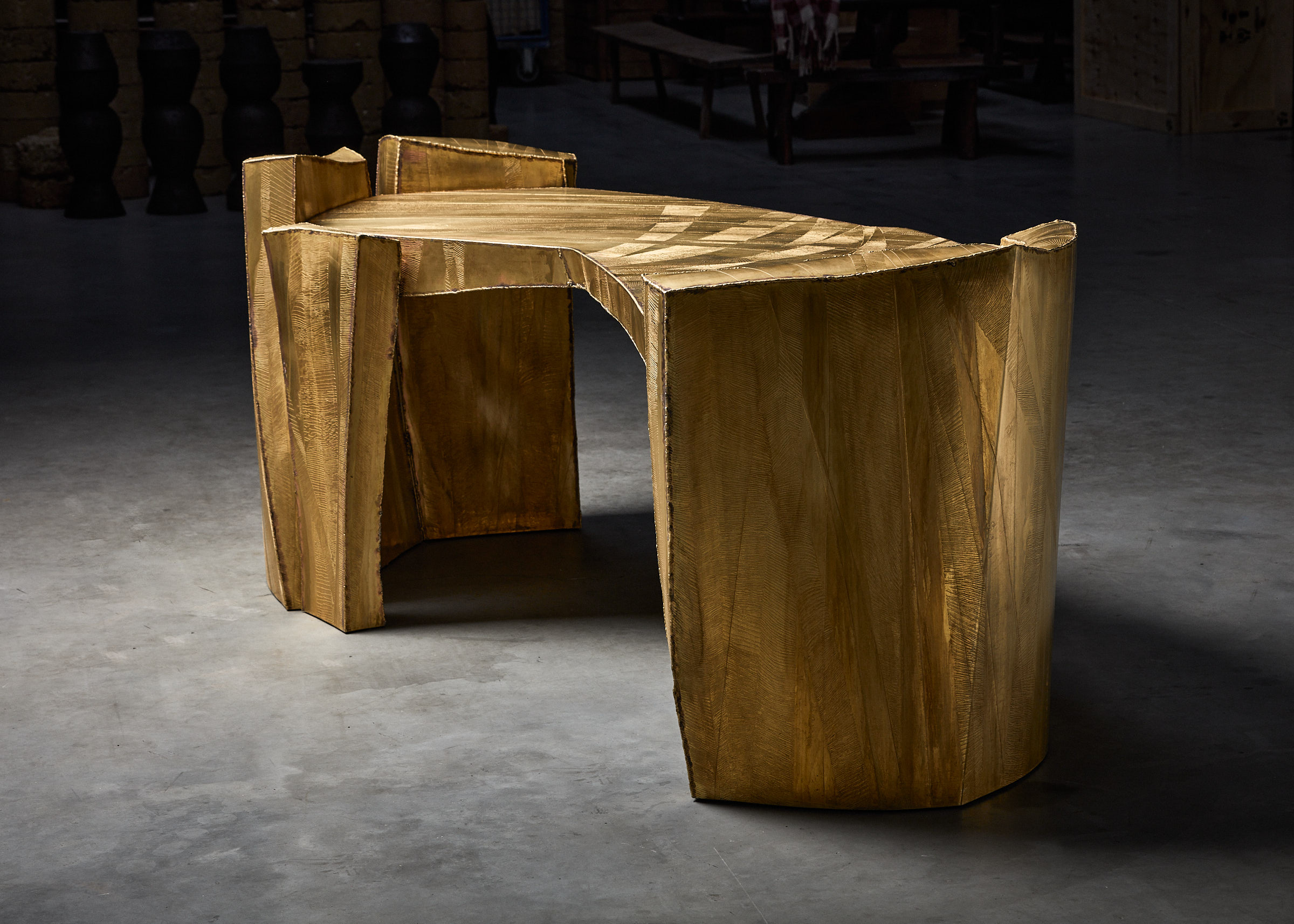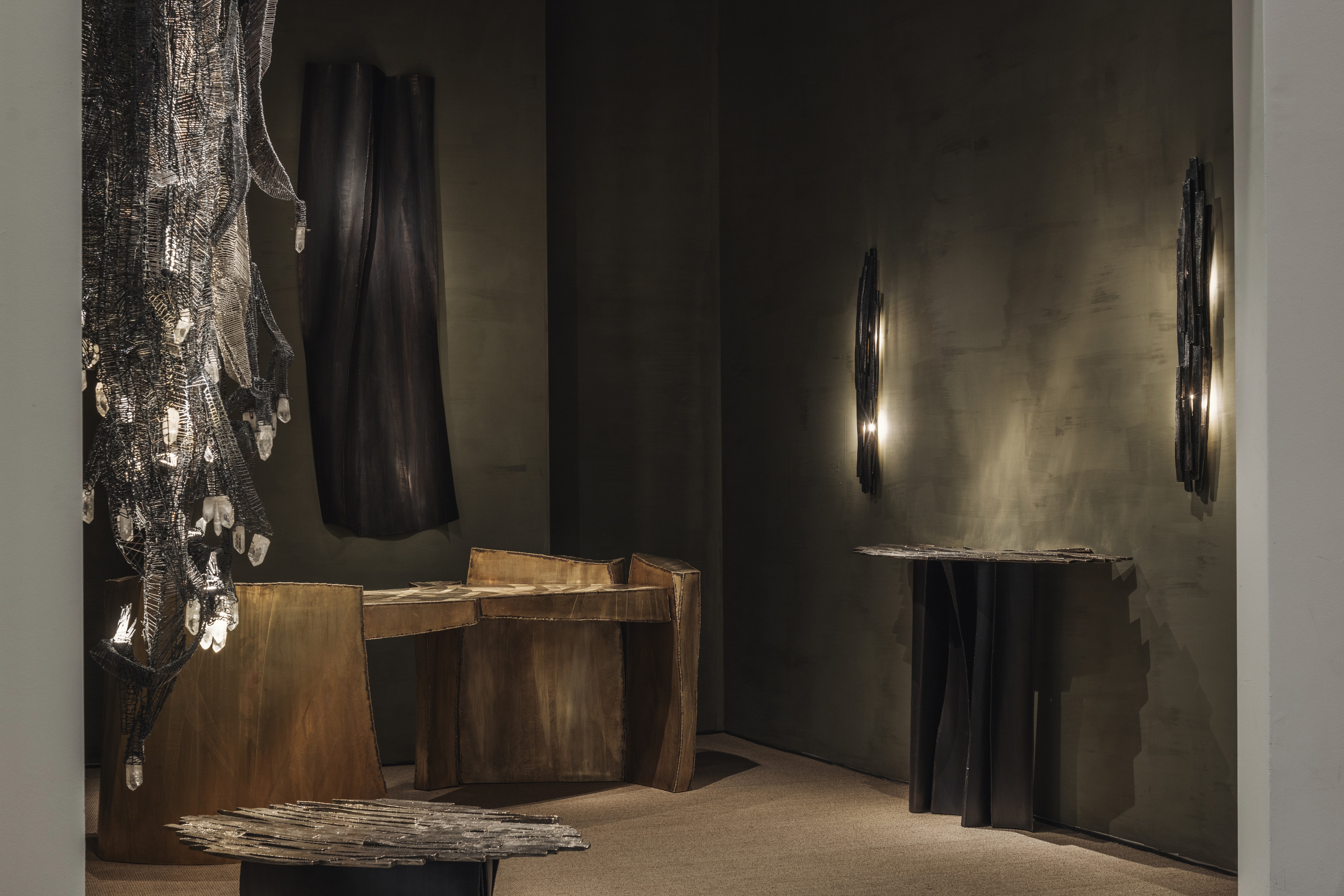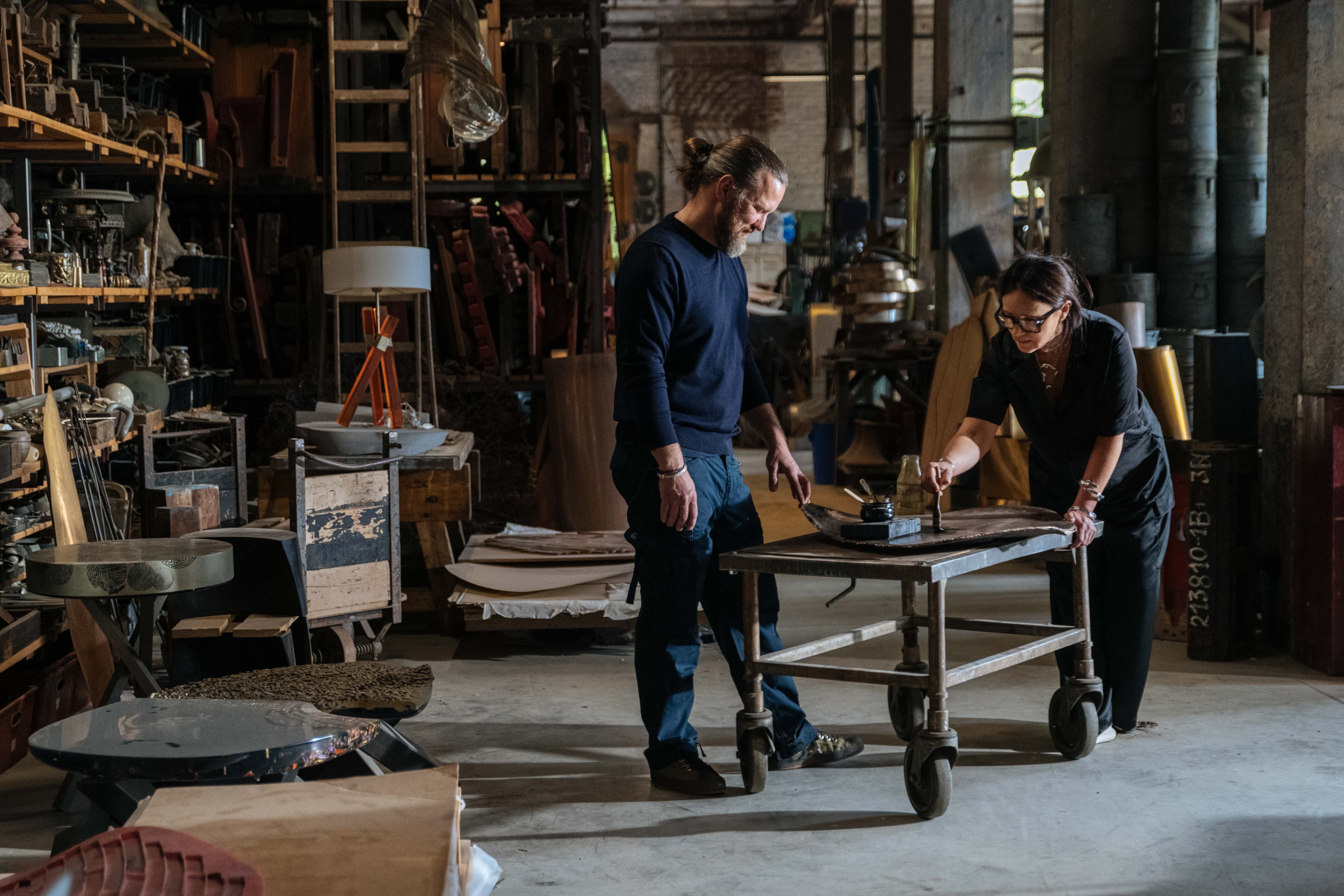 Three creative voices, two generations in harmony. With mastered techniques and a recognizable identity, they craft exclusive works by combining metals and minerals with the refined use of colored resins. Their signature engravings, rooted in a process close to etching, evoke a primitive aesthetic, leaving a trace of existence, a dialogue with the present, and a vision for the future.