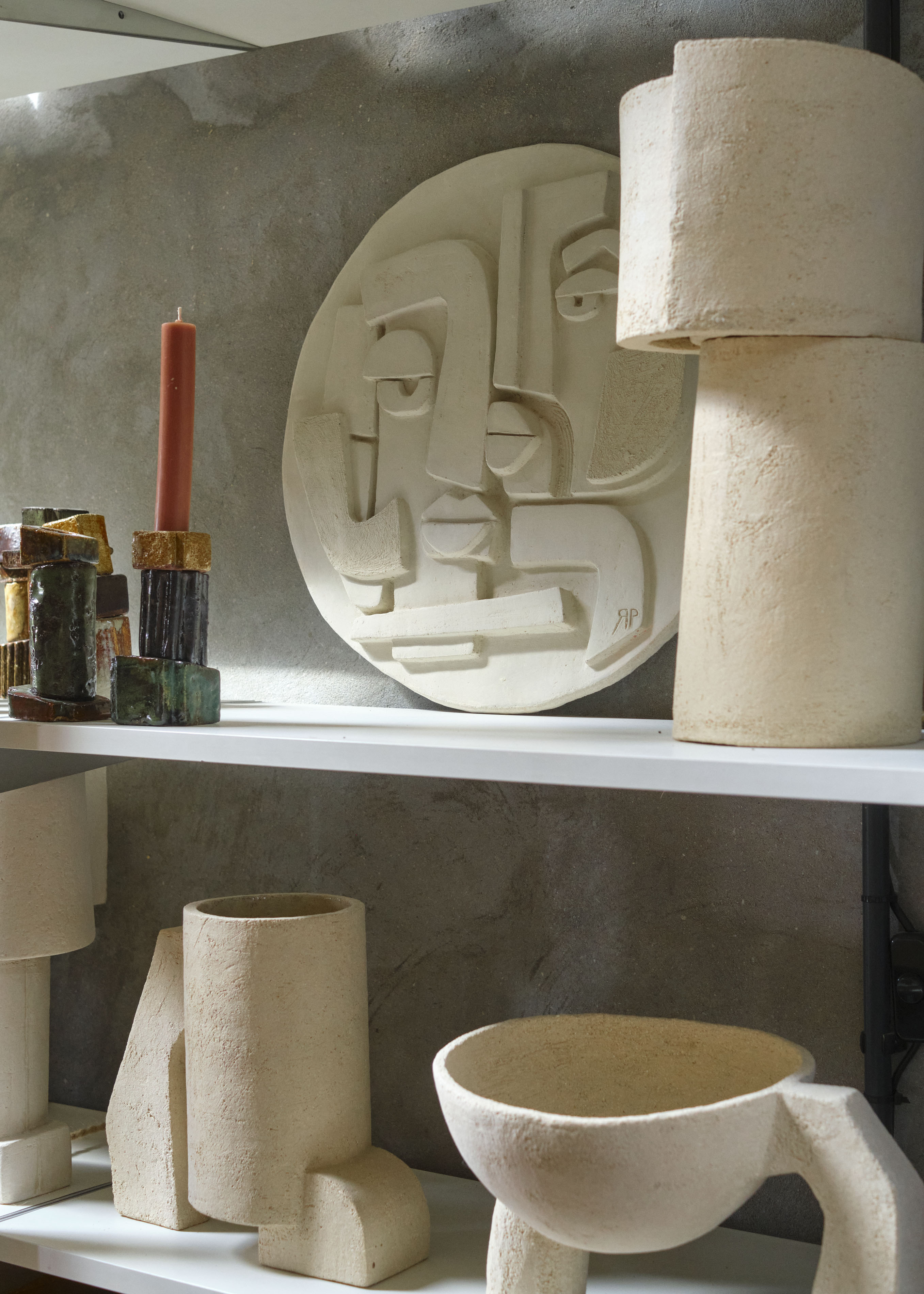 Her wallpapers are visual statements, hand-drawn, digitally enhanced, and often narrative in nature. They explore mythology, fantasy, and sensuality, transforming walls into active storytelling spaces. Her ceramic work, particularly her recent series of candlesticks and columns, draws from architecture, archaeology, and organic forms. Using hand-building techniques and raw clays, she crafts pieces that are both tactile and monumental, often glazed to evoke bronze, stone, or pigment-rich finishes.